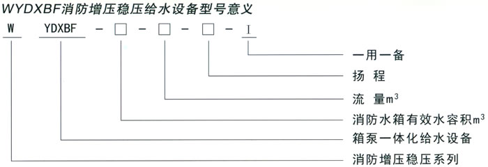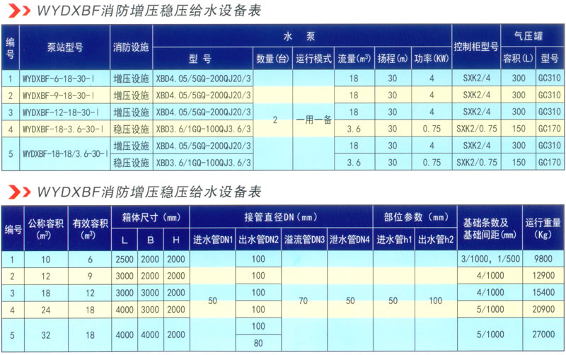 WYDXBF系列消防增壓穩(wěn)壓給水設(shè)備(智能箱泵一體化)◆ 設(shè)備概述: WYDXBF系列消防增壓穩(wěn)壓給水設(shè)備(智能箱泵一體化)是根據(jù)公安部GB27898.1-27898.3-2011《消防氣壓給水設(shè)備的性能要求和試驗方法》和蘇S/T08-2009標(biāo)準(zhǔn)設(shè)計的新型消防專用固定滅火裝置。主要是由不銹鋼消防水箱、消防增壓穩(wěn)壓泵、氣壓罐、控制柜、儀表、導(dǎo)流器、管道附件等組成,廣泛適用于多層和高層建筑工程,有增壓穩(wěn)壓設(shè)計要求的消火栓給水系統(tǒng)及噴淋滅火系統(tǒng)等各類消防給水系統(tǒng)。◆ 設(shè)備特點: 1、平時由穩(wěn)壓泵運行,當(dāng)發(fā)生火災(zāi)時消防主泵啟動,同時穩(wěn)壓泵停止運行。以上過程均由電控系統(tǒng)實行自動轉(zhuǎn)換,本機組設(shè)穩(wěn)壓泵二臺或多臺互為備用,輪流運行。 2、平時由穩(wěn)壓泵進(jìn)行補水,使整個消防管網(wǎng)處于高壓狀態(tài),同時氣壓罐內(nèi)貯存了火災(zāi)初期的消防水量,解決了長期以來消防給水系統(tǒng)中存在的延時滅火問題。 3、設(shè)有自動、手動、消防聯(lián)動、遠(yuǎn)距離操作功能,保護(hù)功能齊全,運行安全可靠。◆ 設(shè)備功能: 1、使消防給水系統(tǒng)最不利點始終保持消防所需壓力; 2、在氣壓罐內(nèi)始終儲存有30秒消防水量,利用氣壓罐所設(shè)定P1、P2、P3、P4運行壓力,控制水泵運行工況,達(dá)到增壓和穩(wěn)壓的功能。 P1為最不利點消防所需壓力(MPa) P2為消防泵啟動壓力(MPa) P3為穩(wěn)壓泵啟動壓力(MPa) P4為穩(wěn)壓泵停泵壓力(MPa)◆ 運行控制過程: 根據(jù)計算求得消火栓系統(tǒng)或自動噴水滅火系統(tǒng)中最不利點所需的消防壓力P1作為氣壓罐的充氣壓力。通過計算所選定的氣壓罐規(guī)格ab值,求得P2,并設(shè)定P3=P2+(0.02-0.03),P4=P3+(0.06-0.06)。平時管道系統(tǒng)如有滲漏等泄壓情況,穩(wěn)壓水泵不斷補水穩(wěn)壓,在P3、P4(啟動=停止)反復(fù)運行,一旦有火情,管道系統(tǒng)大量缺水,造成P3壓力下降(P3-P4),降至P2時,發(fā)出報警信號,立即自動啟動消防主泵,消防主泵啟動后,穩(wěn)壓泵自動停止,消防結(jié)束后,電控柜又自動恢復(fù)穩(wěn)壓泵的控制功能。對設(shè)有消防控制中心的用戶為防止報警誤報,則將報警信號傳給消防控制中心,該中心對信號進(jìn)行綜合處理后,再向電控柜返回啟動消防主泵的信號。◆ 創(chuàng)新功能: 1、無需建泵房,節(jié)省空間; 2、采用靜音型消防泵組,運行無噪音,節(jié)能環(huán)保; 3、將消防泵組全部安裝于水箱內(nèi),具有獨特的消音防凍功能; 4、設(shè)備維護(hù)保養(yǎng)時,無需排放水箱內(nèi)的消防用水,節(jié)約能源; 5、具有水箱缺水報警、故障報警自動切換、消防聯(lián)動功能; 6、本系統(tǒng)采用新標(biāo)準(zhǔn)來生產(chǎn),系統(tǒng)運用了PLC編程,具有巡檢運行記錄數(shù)據(jù)輸出端口,內(nèi)部儲存數(shù)據(jù)等功能。